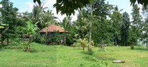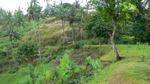 Amlapura-Amed passe en corniche au fond, sous la colline boisée au centre de